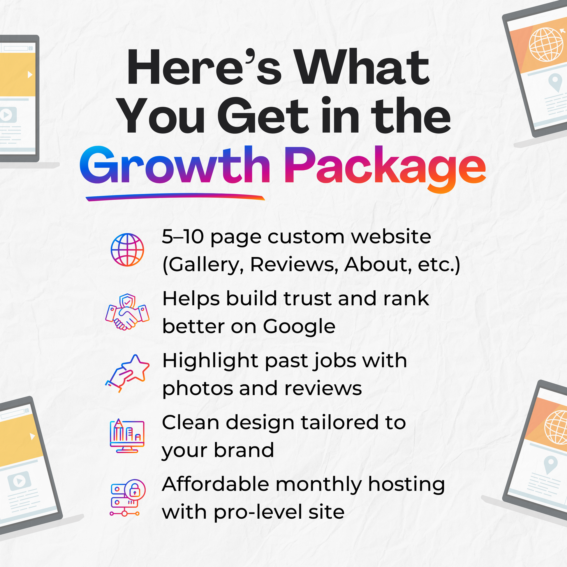 - 5–10 page custom website (Gallery, Reviews, About, etc.)